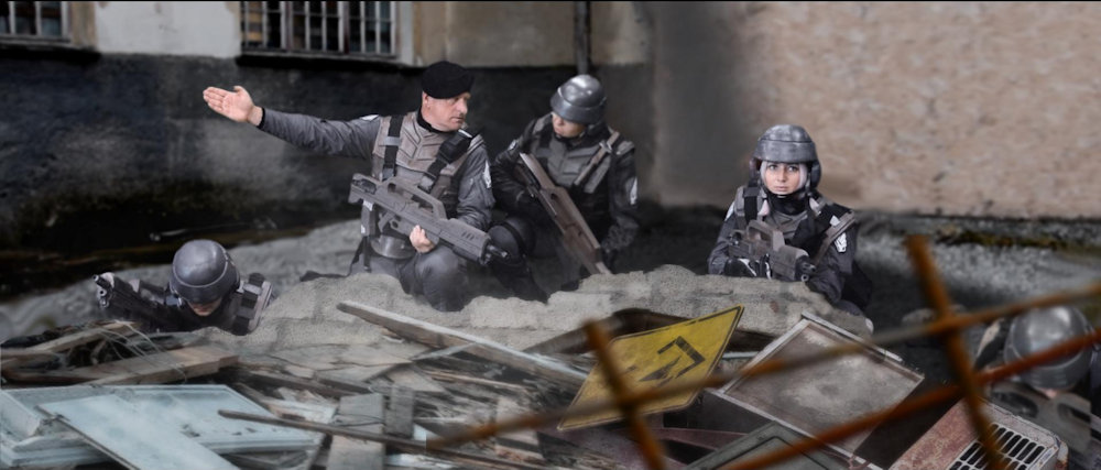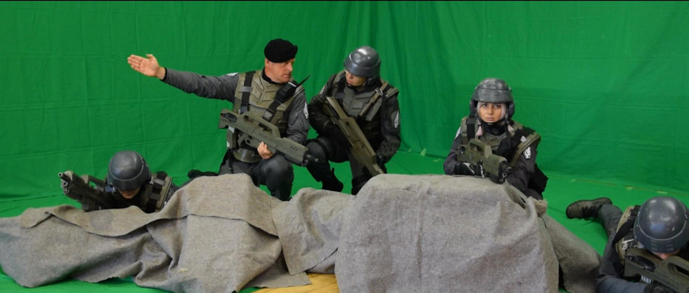 The first problem to solve was to get a closed location with some space to have enough distance for the camera. At this point I got a hint from my friend Martin to ask the owner of the Martial art academy in Munich East, where he trains usually. In July, we got the agreement to get their rooms for a weekend. They have a really nice huge room for their training, and we changed it into a green room studio. Two walls each 6 meter and the floor was covered with green cotton. In it, we build the set. First was an outside scene where the whole team of troopers has to enter a building. The complete environment should be replaced later by VFX.